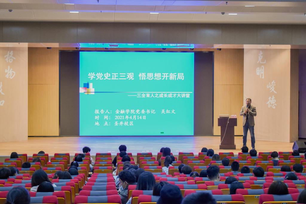 (通讯员:苏晓萌)为庆祝建党100周年,深入推进党史学习教育,帮助大学生树立正确的世界观、人生观、价值观,4月14日晚,由学生处主办,金融学院承办的第292期“成长·成才”大讲堂在圣井校区文化活动中心多功能厅开讲。金融学院党委书记吴红文做了“学党史正三观,悟思想开新局”的主题报告。学校圣井校区300多名入党积极分子、学生骨干参加了此次活动。