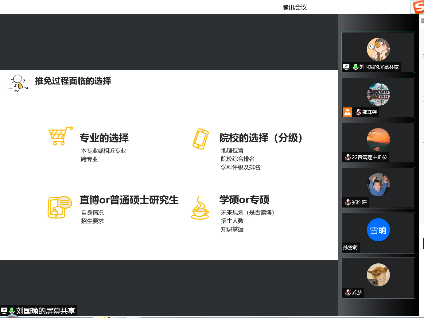 为进一步帮助学生做好未来升学规划,了解本科生推免的详细流程和安排,9月21日晚,金融学院举办毕业生线上分享会,邀请了本院2022届优秀毕业生刘国瑜进行经验交流和答疑解惑。本次分享会由邵珠建老师主持,金融学院部分学生参加。