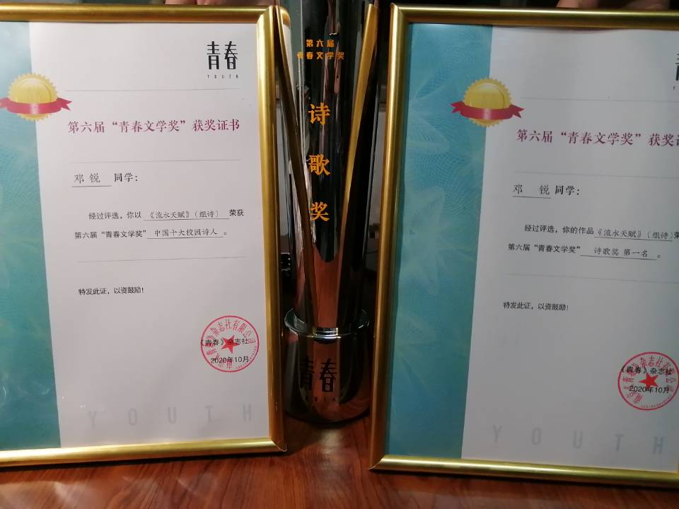 2020年10月31日,由南京文学之都促进会、《青春》杂志社共同主办的 2020“文学之夜”暨第六届“青春文学奖”颁奖活动在南京文化艺术中心举行。金融学院学生邓锐以其组诗《流水天赋》荣获诗歌组第一名,并获得2020年度中国十大校园诗人奖。