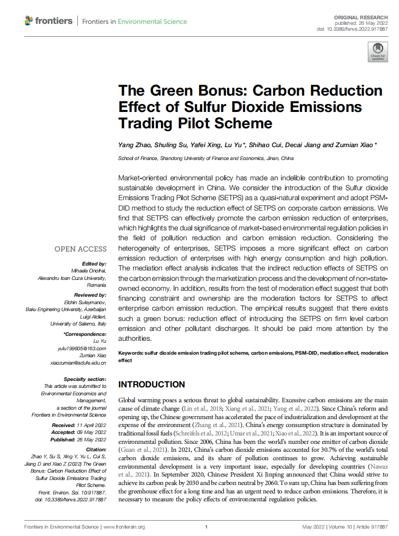 金融学院肖祖沔副教授(通讯作者)与宿淑玲副教授及邢雅菲讲师共同指导2019级金融创新实验班本科生赵洋(第一作者)在期刊《Frontiers in Environmental Science》发表论文“The Green Bonus: Carbon Reduction Effect of Sulfur Dioxide Emissions Trading Pilot Scheme”(绿色红利:二氧化硫排放权交易机制的碳减排效应,发表于2022年5月 Vol.10)。该期刊系JCR二区SCI期刊,影响因子为4.581,属我校A2类期刊。论文合作者包括山东财经大学金融学院硕士研究生于露(通讯作者)以及本科生崔世豪、姜德才。