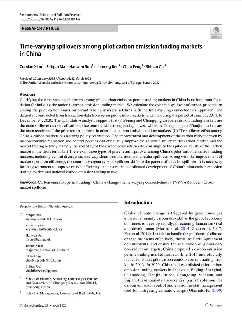 金融学院肖祖沔副教授作为第一作者在期刊《Environmental Science and Pollution Research》发表论文“Time‑varying spillovers among pilot carbon emission trading markets in China”(2022年第3期)。该期刊系JCR二区SCI期刊,影响因子为4.223,属我校A2类期刊。合作者包括英国巴斯大学助理教授孙汉文;山东财经大学金融学院硕士研究生马世群、封超及本科生任佳萌、崔世豪。