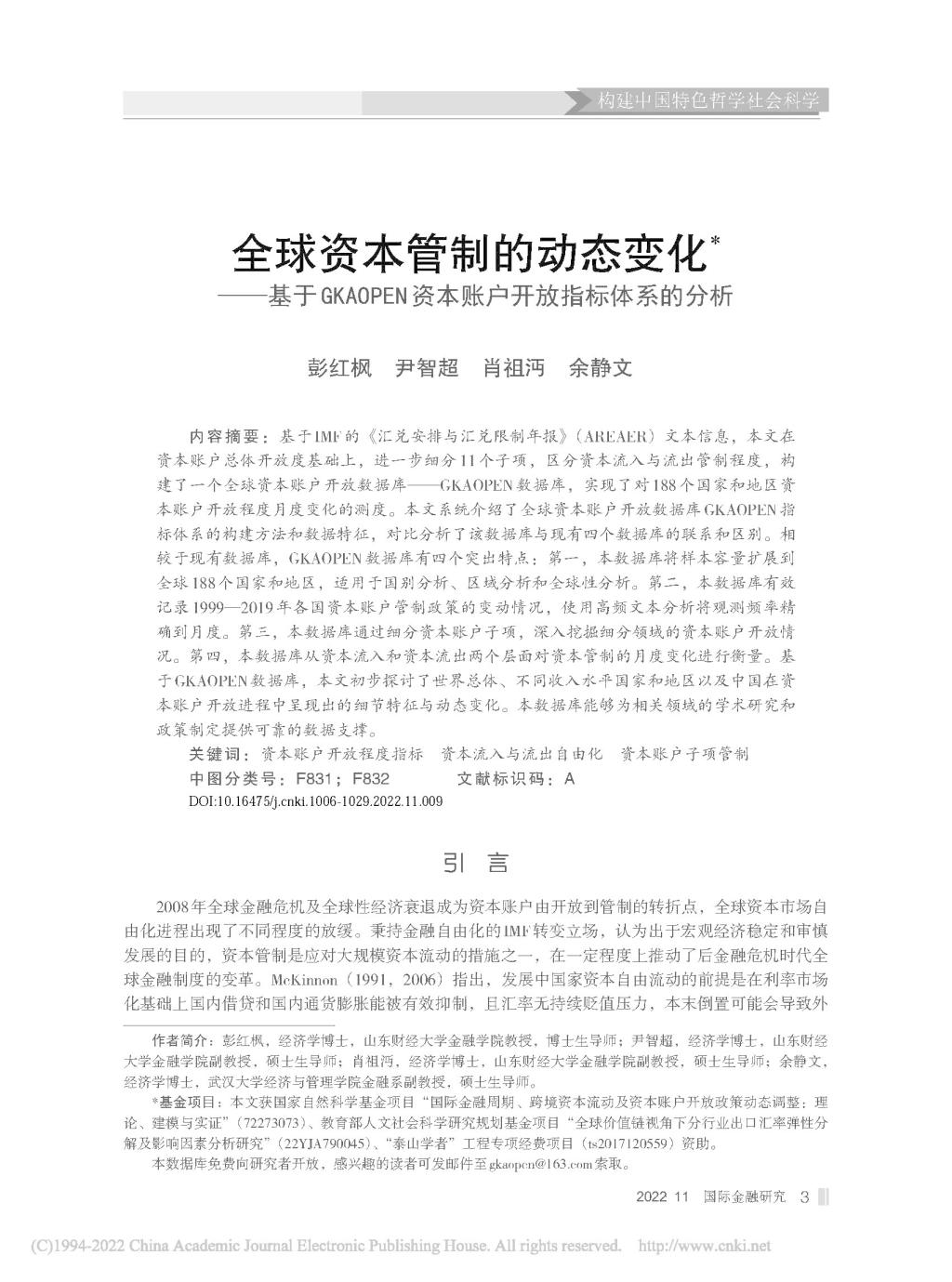 金融学院彭红枫教授、尹智超副教授、肖祖沔副教授与武汉大学余静文副教授合作撰写的论文《全球资本管制的动态变化——基于GKAOPEN资本账户开放指标体系的分析》在《国际金融研究》2022年11期发表。该期刊属于我校A2期刊。