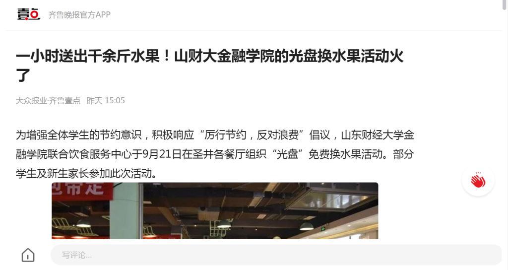 (通讯员:王庆林)为增强我校全体学生的节约意识,积极响应“厉行节约,反对浪费”倡议,金融学院联合饮食服务中心于9月21日在圣井各餐厅组织“光盘”免费换水果活动。部分学生及新生家长参加此次活动。
