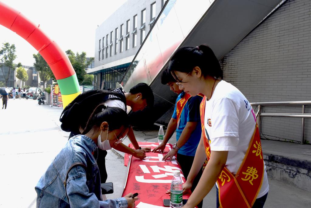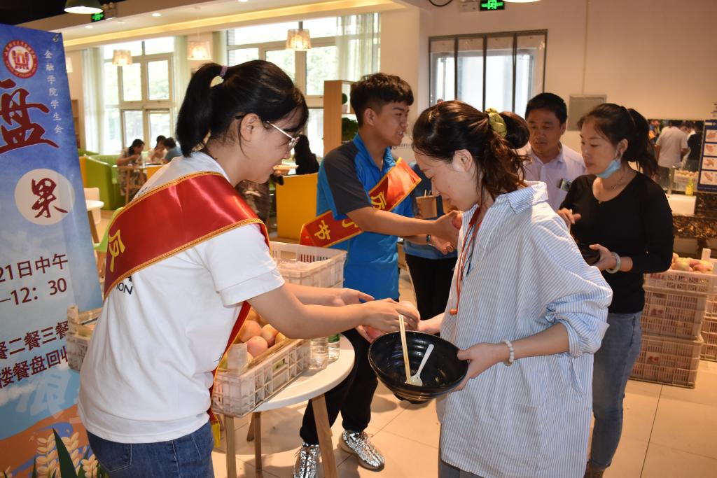 “金融先锋”志愿者团队于各餐厅一楼餐具回收处摆放宣传海报并设置水果发放点,在餐厅门口设置横幅签名处。中午就餐高峰期,活动现场井然有序、忙而不乱,很多师生积极响应号召,来到活动现场展示“光盘”,并在横幅上签字后领取水果。恰逢报到日,大一新生与家长积极参与“光盘”行动,来到活动现场询问进展情况,对活动给予肯定性的评价。一位新生家长表示,虽然现在物质生活比较丰富,但大学生也应该积极响应国家号召,重拾勤俭节约、艰苦朴素的生活作风,不辜负老一辈革命者的奉献。据悉,活动现场累积送出水果1000余斤,收集签名近千个,收到了同学与家长的一致好评。