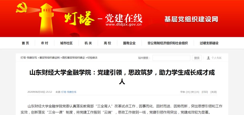 (通讯员 :邵珠建、李勇)疫情防控期间,山东财经大学金融学院党委积极组织落实学校防疫工作,实施教育部“三全育人”改革试点工作,因事而化、因时而进、因势而新,突出思想引领和工作实效,创新落实“三会一课”制度,将党建工作搬到“云端”,思政工作做到一线,党建引领作用突出,思想政治教育成效显著。