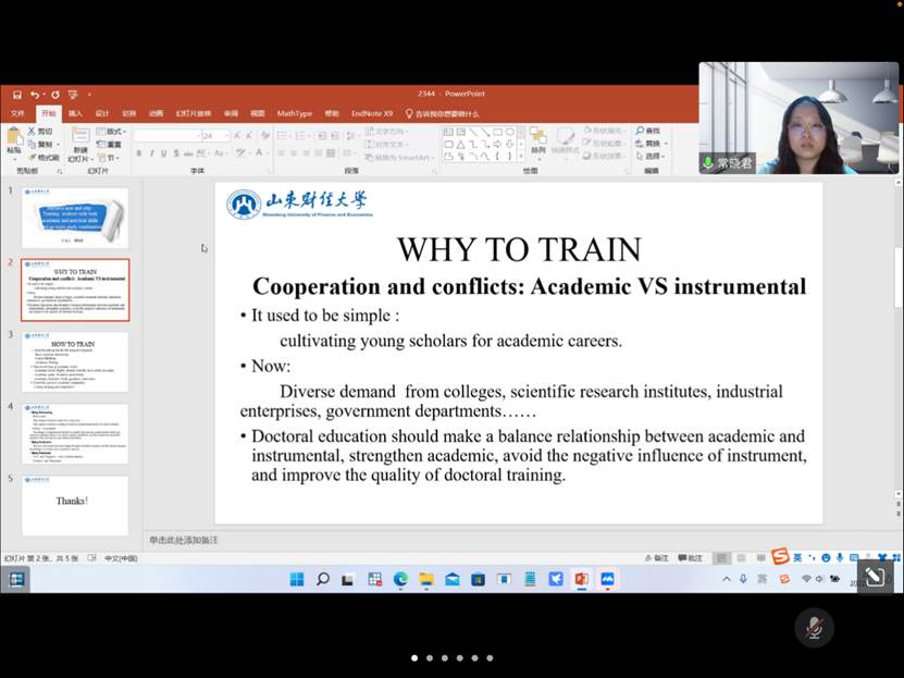 彭红枫院长就山东财经大学金融学院的研究生培养现状进行了分享,说明了学术型研究生和专业型研究生的区别,目前学院攻读博士的现状和学生培养存在的问题。提出了从课程开始提高研究生培养质量的建议,并指出目前学院实行的专业型硕士的双导师制在一定程度上缓解了学生实习和寻找工作的问题。并提出下一步要结合大家的建议进一步优化研究生培养方案。
