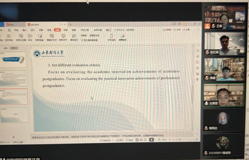 会议的下半场由山东财经大学金融学院的研究生进行主题发言,提出自己对于研究生培养和学科建设主题的看法并做出分析。