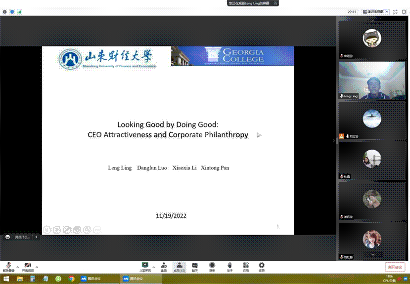 (通讯员:刘立安)11月21日上午,由山东财经大学金融学院、山东财经大学金融国际研究中心和山东省金融产业优化与区域管理协同创新中心共同主办的第28期“泰山金融论坛”通过腾讯会议在云端举行。美国Georgia College & State University金融学终身教授、山东财经大学特聘教授凌崚老师应邀做客本次论坛并分享最新研究成果。本次论坛题目为“Looking Good by Doing Good: CEO Attractiveness and Corporate Philanthropy”,由金融工程系主任刘立安主持。金融学院副院长王倩和部分教师及研究生参加了此次论坛。