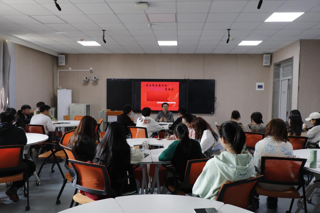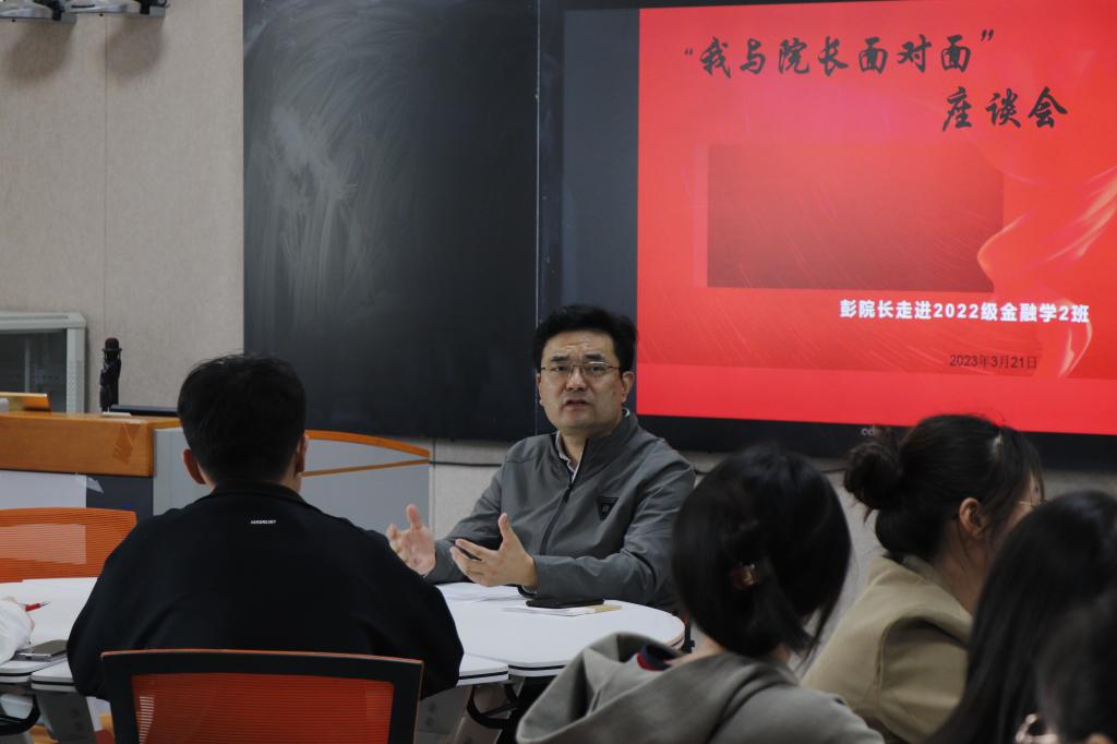 3月21日中午,金融学院在圣井校区组织“我和院长面对面”师生座谈会,金融学院院长彭红枫走进2022级金融学2班,与同学们进行座谈交流。学院团委书记郭夕煕,2022级辅导员陈玉林以及班级全体同学参加了本次座谈。