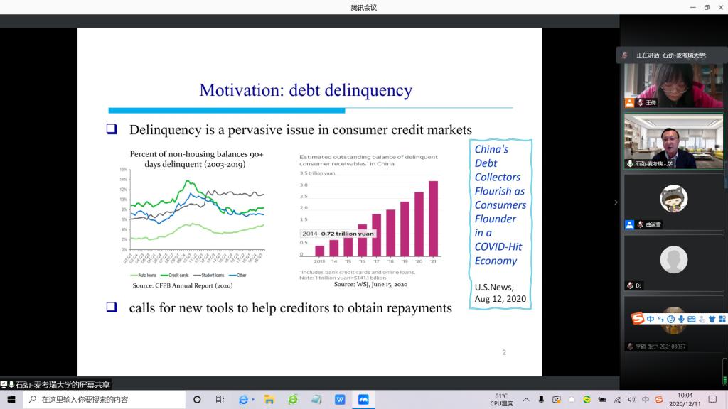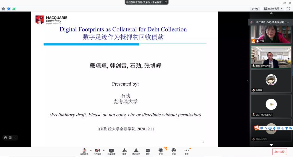 (通讯员:王倩、曲诞雪)12月11日上午,由山东财经大学金融学院、山东省金融产业优化与区域管理协同创新中心、山东财经大学金融国际研究中心联合举办的第15期“泰山金融学术训练营”通过腾讯会议举行,澳大利亚麦考瑞大学商学院金融学教授、山东财经大学金融国际研究中心执行主任石劲老师应邀做客本次学术训练营,为师生们带来了题为“Digital Footprints as Collateral for Debt Collection”的讲座,学术训练营由银行系主任王倩老师主持,学院部分教师和研究生参加了本次活动。