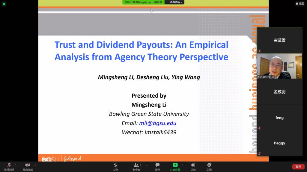 (通讯员:孟纹羽、曲诞雪)12月23日上午,由山东财经大学金融学院、山东省金融产业优化与区域管理协同创新中心和山东财经大学金融国际研究中心联合举办的第19期“泰山金融学术训练营”通过Zoom Meeting举行,美国Bowling Green State University金融学教授李明生老师应邀做客本次学术训练营,为师生们带来了题为 “Trust and Dividend Payouts: An Empirical Analysis from Agency Theory Perspective” 的讲座,学术训练营由金融学院金融科技系主任孟纹羽老师主持,学院部分教师和研究生参加了本次活动。