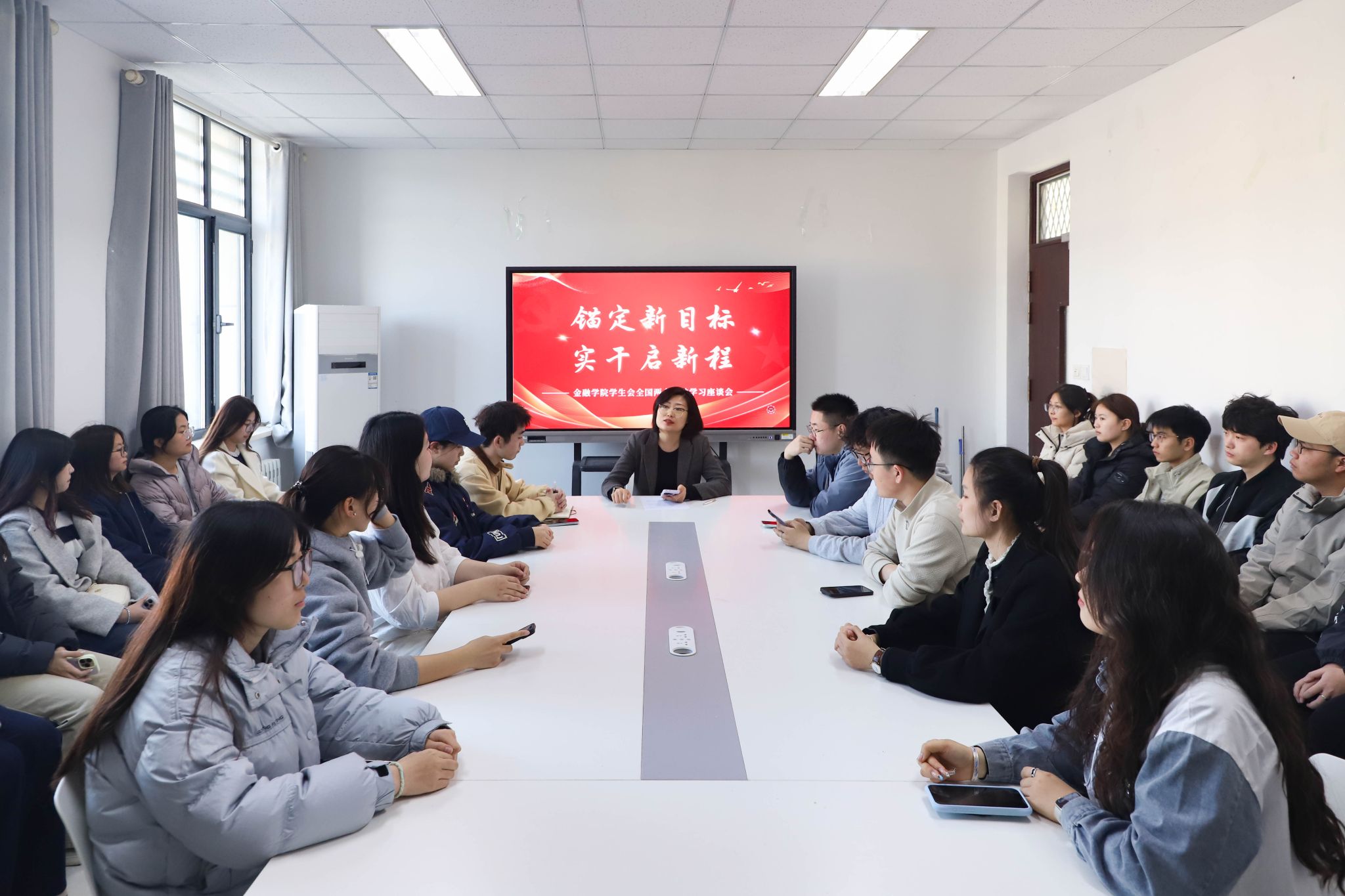 为全面学习贯彻2026年全国两会精神,引导青年学子准确把握国家发展大局,提升思想政治素养,3月19日,山东财经大学金融学院学生会召开全国两会精神学习座谈会。金融学院团委书记郭夕熙老师、学生会主席团成员与各部门代表参加本次学习交流。
