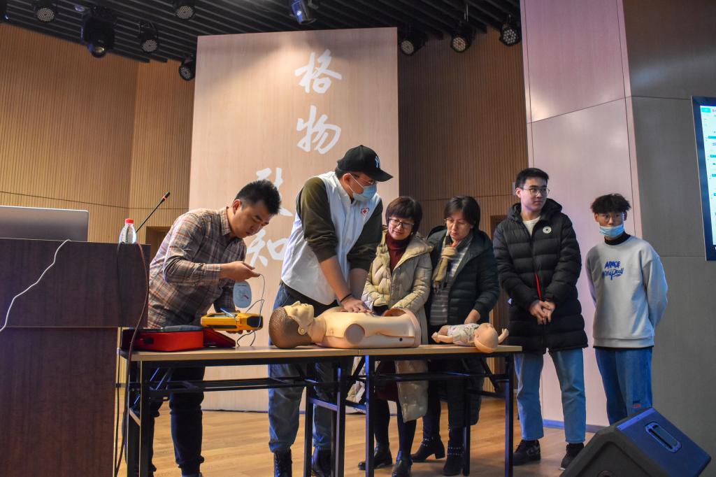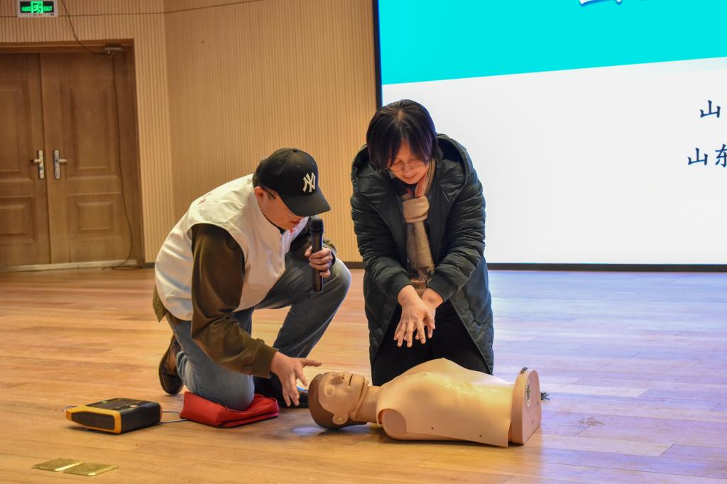 首先,山东大学齐鲁医院院前急救科李尧医生向同学们普及了院内外急救体系的相关知识以及进行心肺复苏的步骤,介绍了除颤仪相关设备的操作方法。随后,李医生讲解了俯卧位、溺水等特殊情况下心肺复苏的知识,介绍了气道梗阻的急救知识以及应急方法,并现场演示了婴儿救治过程中的相关注意事项。最后,协会医护人员利用教学器材进行了心脏复苏的现场教学,现场老师和同学们踊跃上台进行心肺复苏模拟练习。