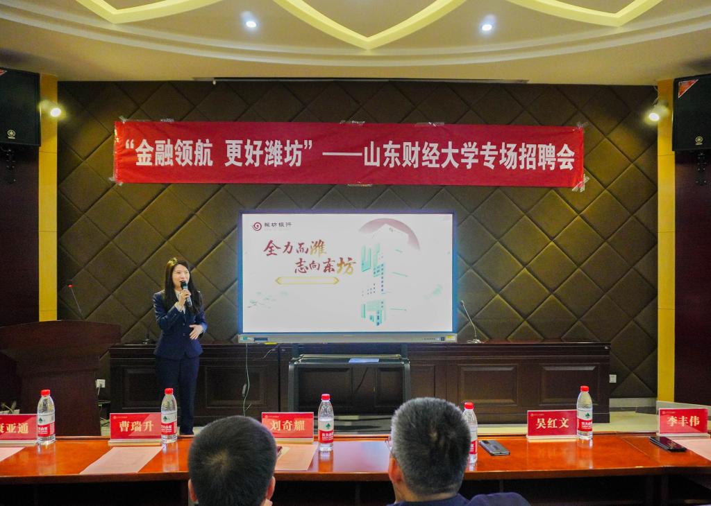 启动仪式上,刘奇耀处长介绍了学校在人才培养、学科建设方面取得的成就,表达了对用人单位的欢迎、对招聘会的期待和对毕业生的祝福。刘明局长在致辞中高度肯定了山东财经大学在财经教育领域的贡献,介绍了潍坊市近年来在金融领域的快速发展和取得的显著成就,热情邀约毕业生到潍坊就业。潍坊奎文区金融协会发布了本次招聘会用人企业总体需求情况,详细讲解了潍坊市人才购房补贴、租房补贴、生活补贴等政策。会上,潍坊银行、中信证券(山东)有限责任公司潍坊分公司、永拓会计师事务所(特殊普通合伙)山东分所、迈赫机器人自动化股份有限公司先后推介了企业及用工需求、人才培育机制等情况。