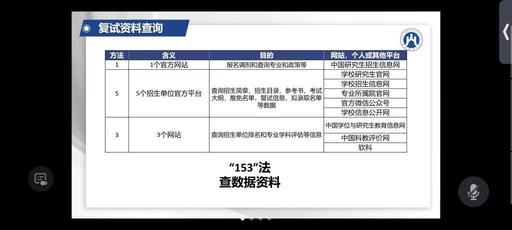 本次讲座主要围绕“复试综合指导”、“调剂规划与调剂流程”、“现阶段复试与调剂准备思路”这三个板块展开详细介绍。首先,黄老师进行了考研形势分析,紧接着详细介绍了复试的具体流程,并针对综合考试内容与考试形式总结提出了数据资料查找方法——“153查找资料法”,以便帮助同学们高效查找讯息。随后黄老师总结展示了2024考研复试重要时间节点。接着,黄老师又详细讲解了调剂流程——查询计划余额信息、填报调剂志愿、复试、待录取四步,随后结合往年数据为同学们进行了调剂竞争分析,并进一步讲解了调剂资料查询方案。最后老师总结表学生疑问给出了具体答疑回复。