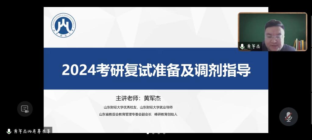为帮助需要调剂的考生提供及时、有效的信息和服务,帮助学生全面了解掌握复试、调剂流程和方法,提升2024届考研成功率,2024年3月8日下午我院召开了关于“2024考研复试及调剂指导”专题讲座,并邀请山东财经大学就业导师、山东财经大学优秀校友、山东教促会教育管理专委会副会长黄军杰老师担任主讲嘉宾。