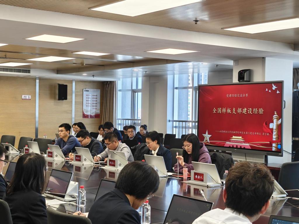 金融学院研究生第三党支部书记梁子敏就全国样板党支部建设工作进行了经验分享,并表示将通过调研、学习,把自己的所学化为实际的应用,努力将论文写在祖国大地上。